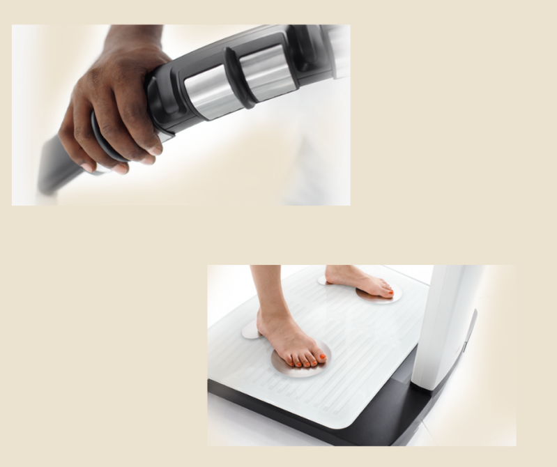 Gewebeanalyse: Der Strom fließt durch den Körper und durchdringt dabei die verschiedenen Gewebearten. Verschiedene Gewebearten, wie Muskeln, Fett, Knochen und Wasser, leiten den elektrischen Strom unterschiedlich gut. Die Seca mBCA 555 erfasst diese Unterschiede und ermittelt so die Zusammensetzung des Körpers.